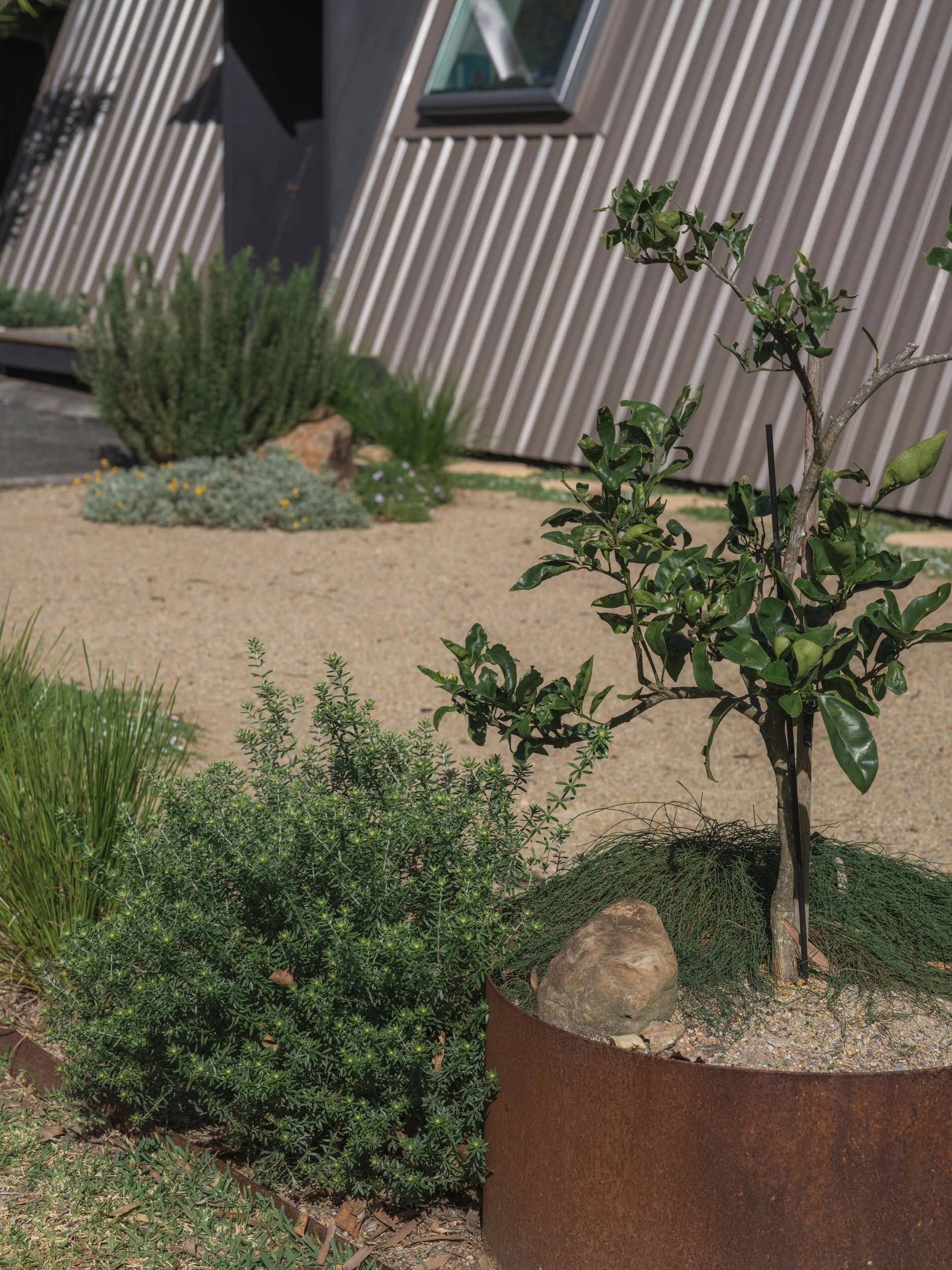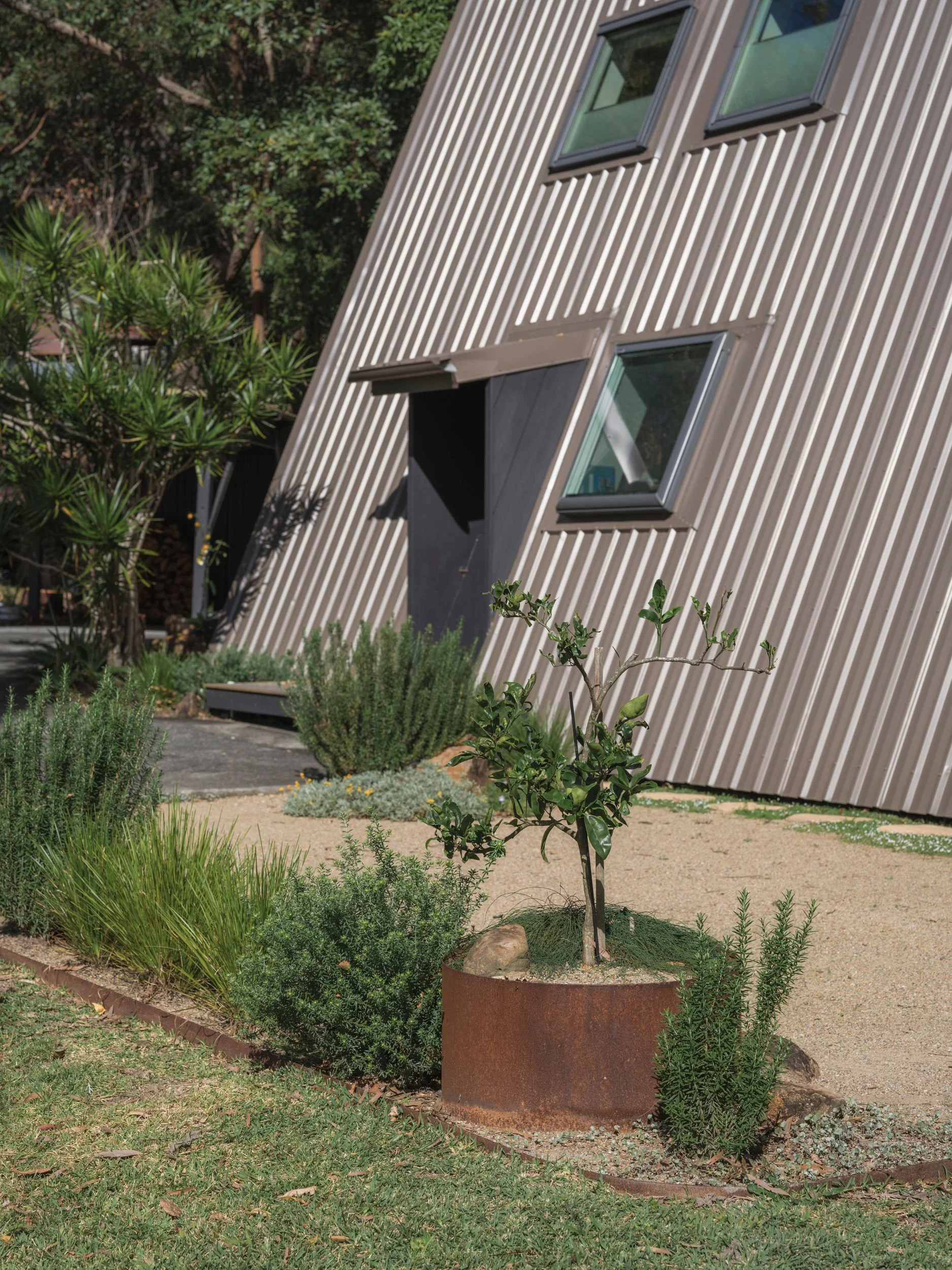 Modern building with slanted beige metal siding, three angled windows, and a black door, surrounded by small bushes and a young tree in a rusty metal planter.