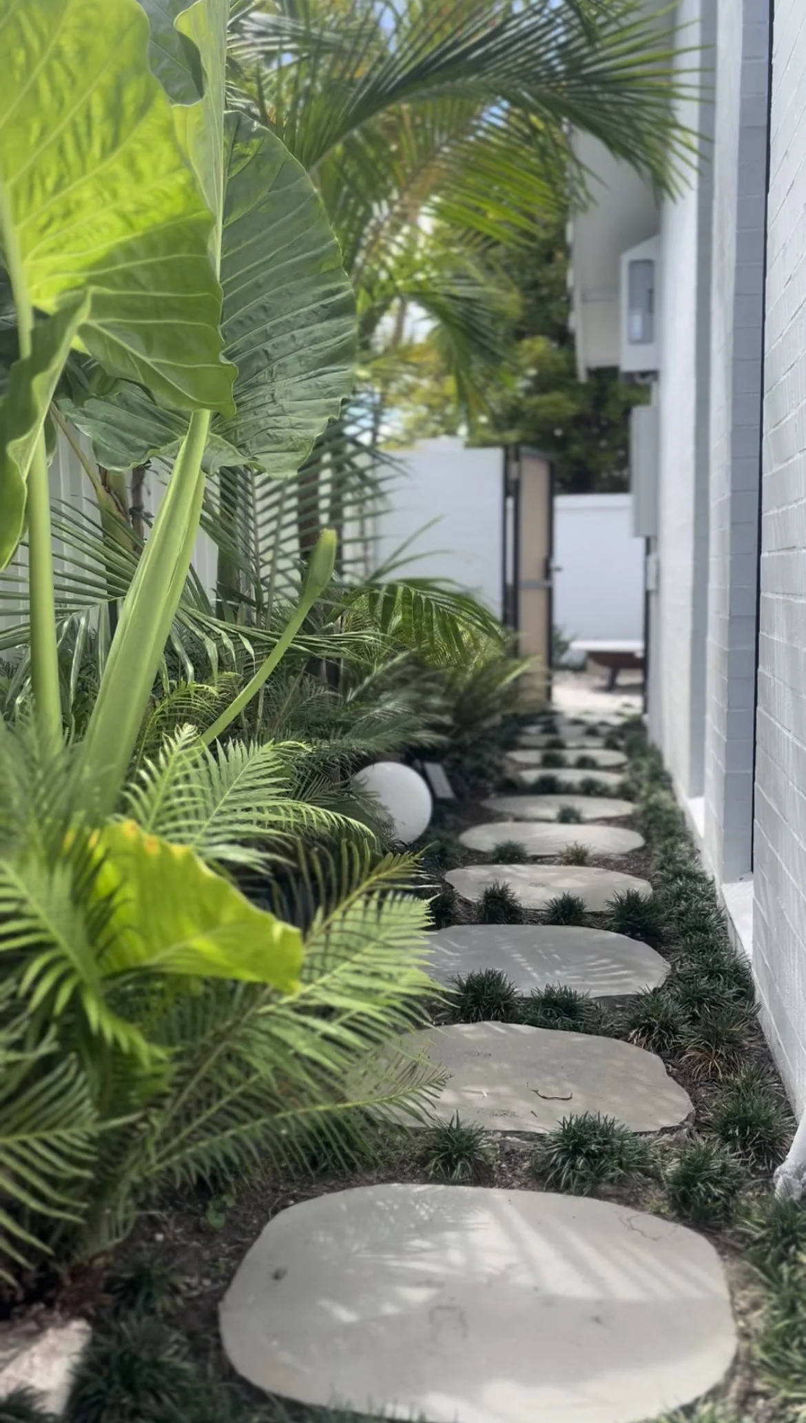 Stone pathway with grass and tropical plants along a white exterior wall, outdoor garden setting.