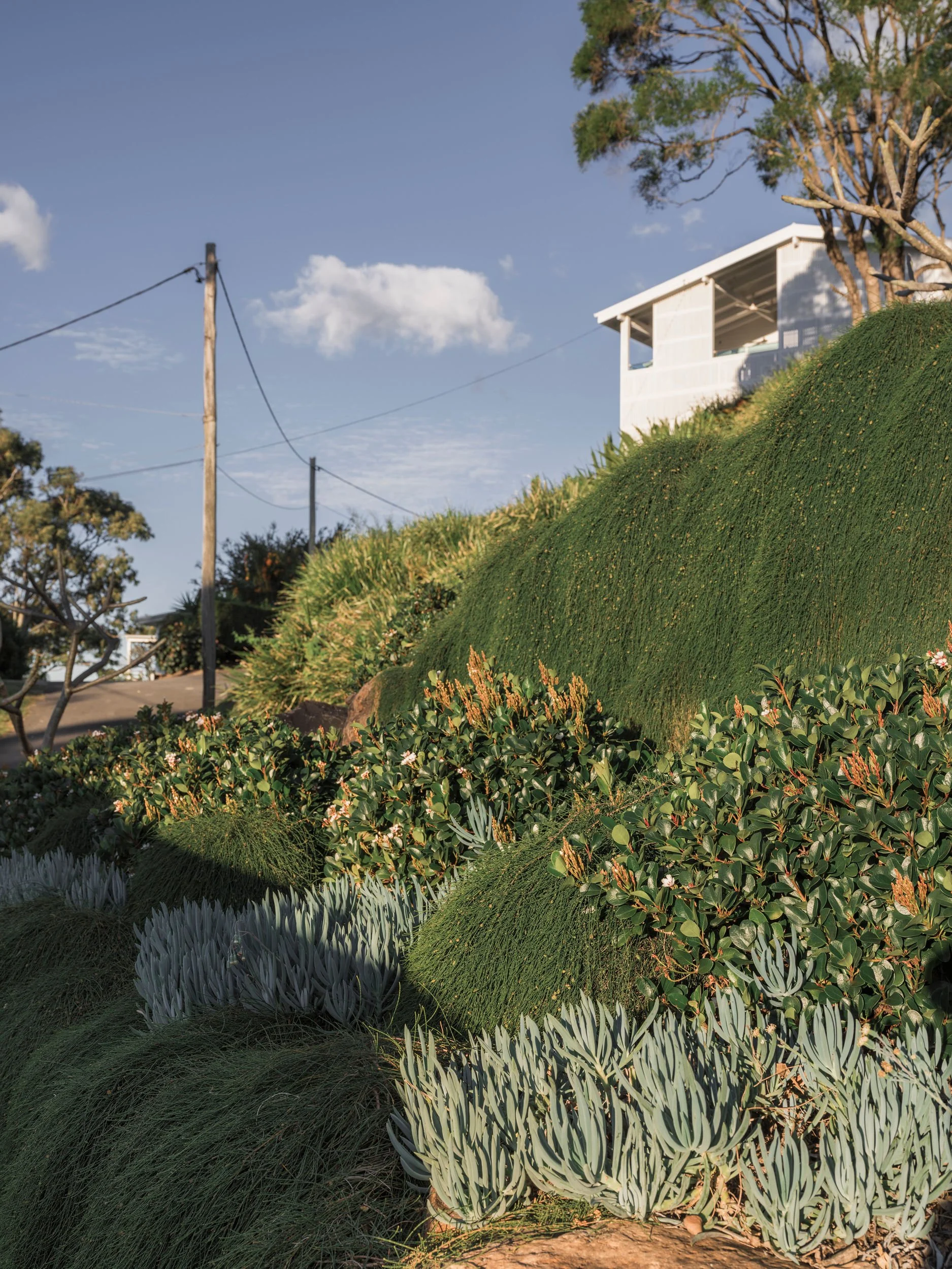 Plants for retaining walls. Casuarina glauca Cousin It, Raphiolepis Oriental Pearl, Senecio serpens Blue Chalksticks, Fr