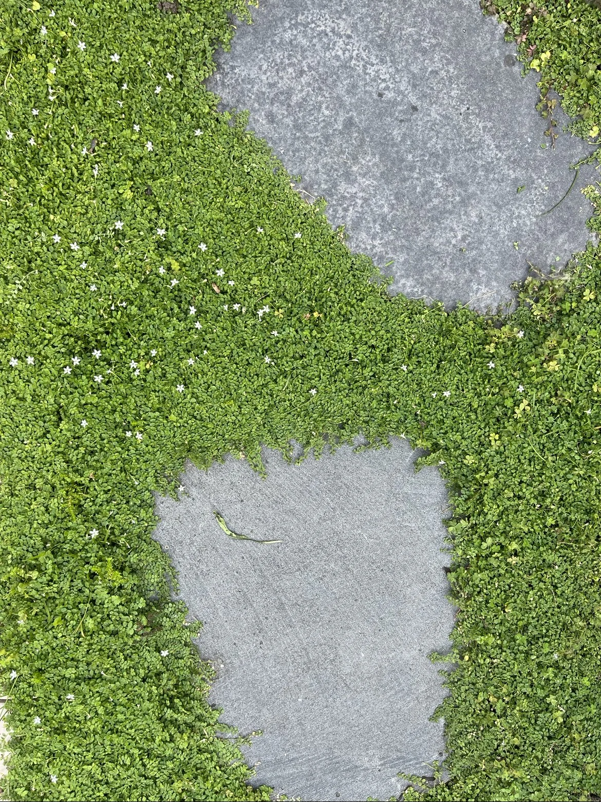 Close-up of stone pathway with small green plants and white flowers growing around the edges.