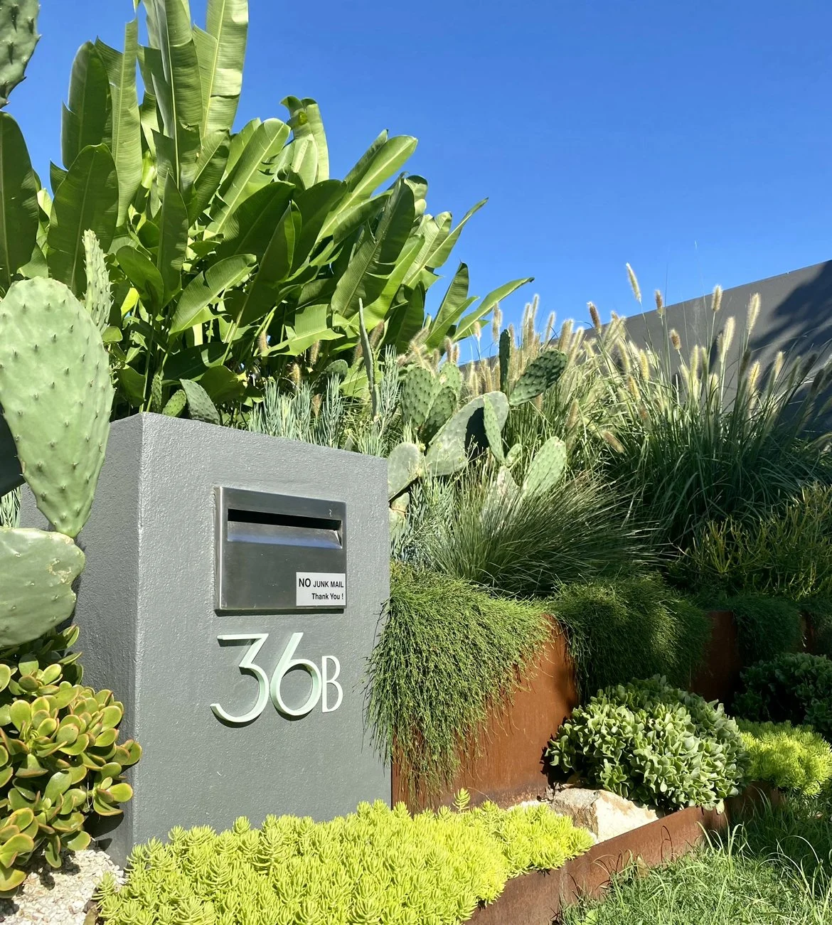 Modern house number sign '36B' in front of a garden with cacti, succulents, and tall grasses, under a clear blue sky.