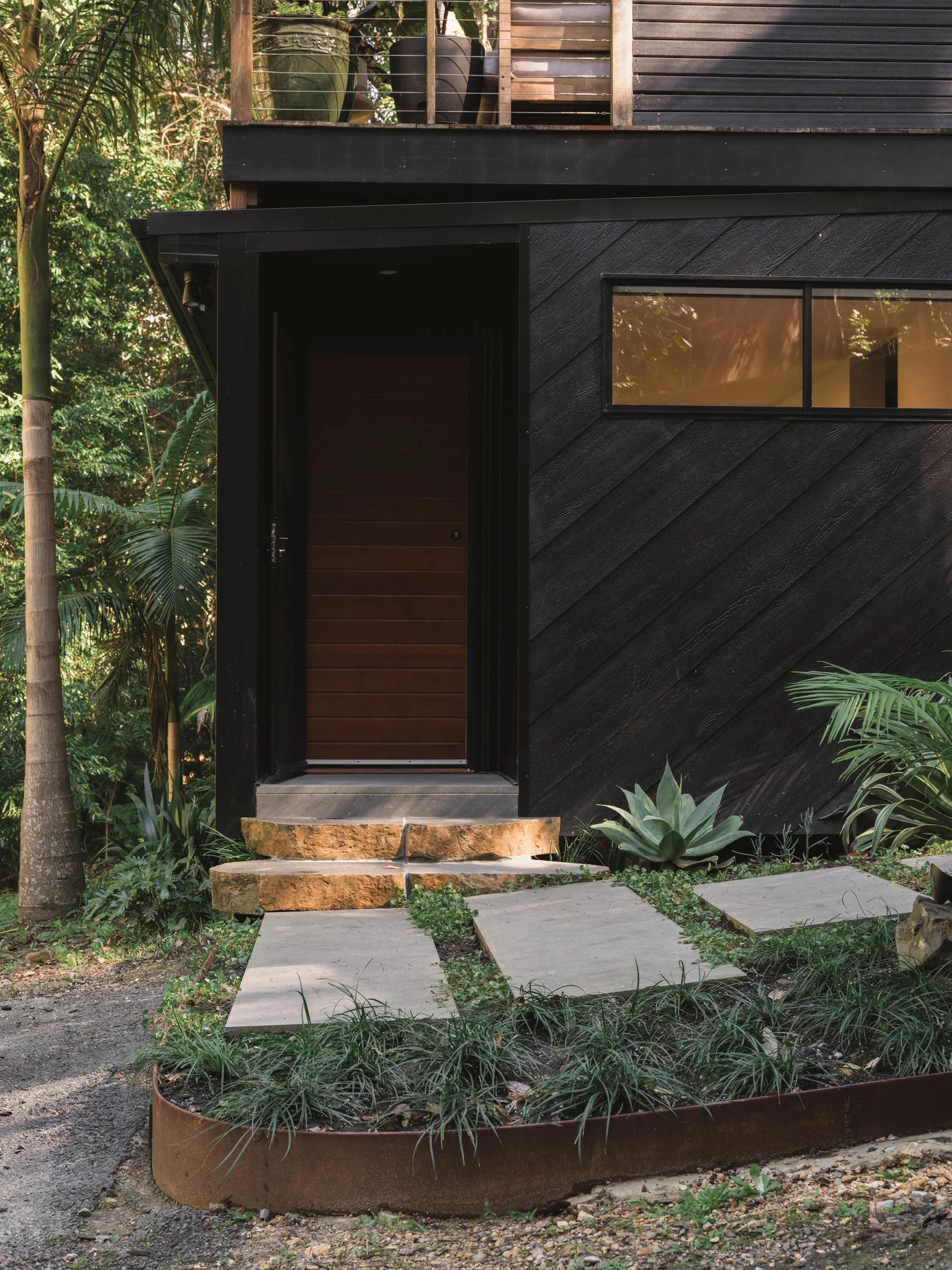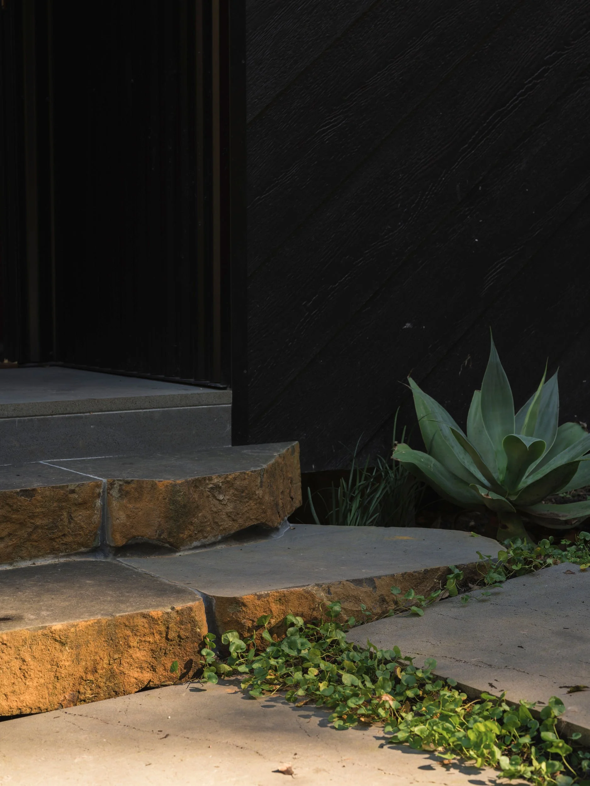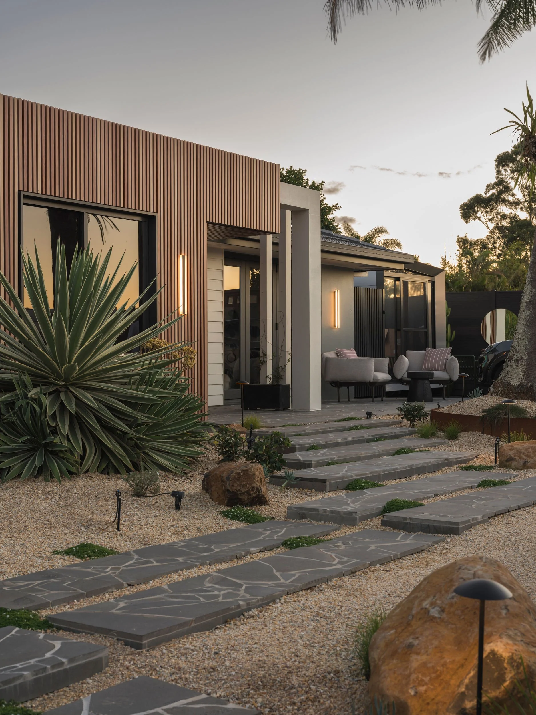 Rugged, natural cut basalt steps blend seamlessly with smooth cut bluestone pavers to create a stunning entrance to this newly renovated home. All softened with Dichondra and Agave attenuata.