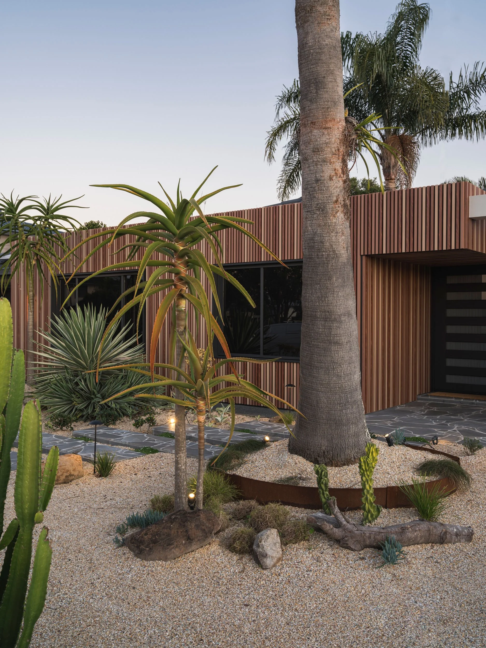 Modern house with desert landscaped yard featuring a tall palm tree, various succulent plants, rocks, and gravel, with warm lighting at dusk.