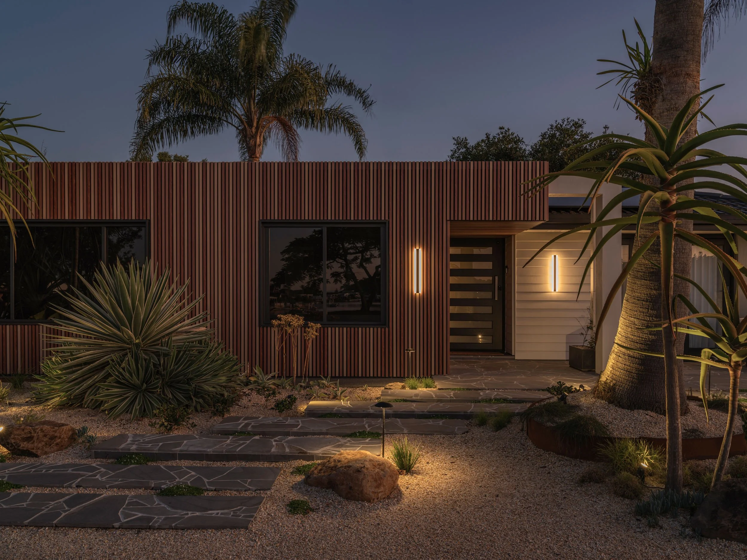 Modern house with wooden exterior, illuminated by outdoor lights, surrounded by desert plants and a stone pathway at dusk.