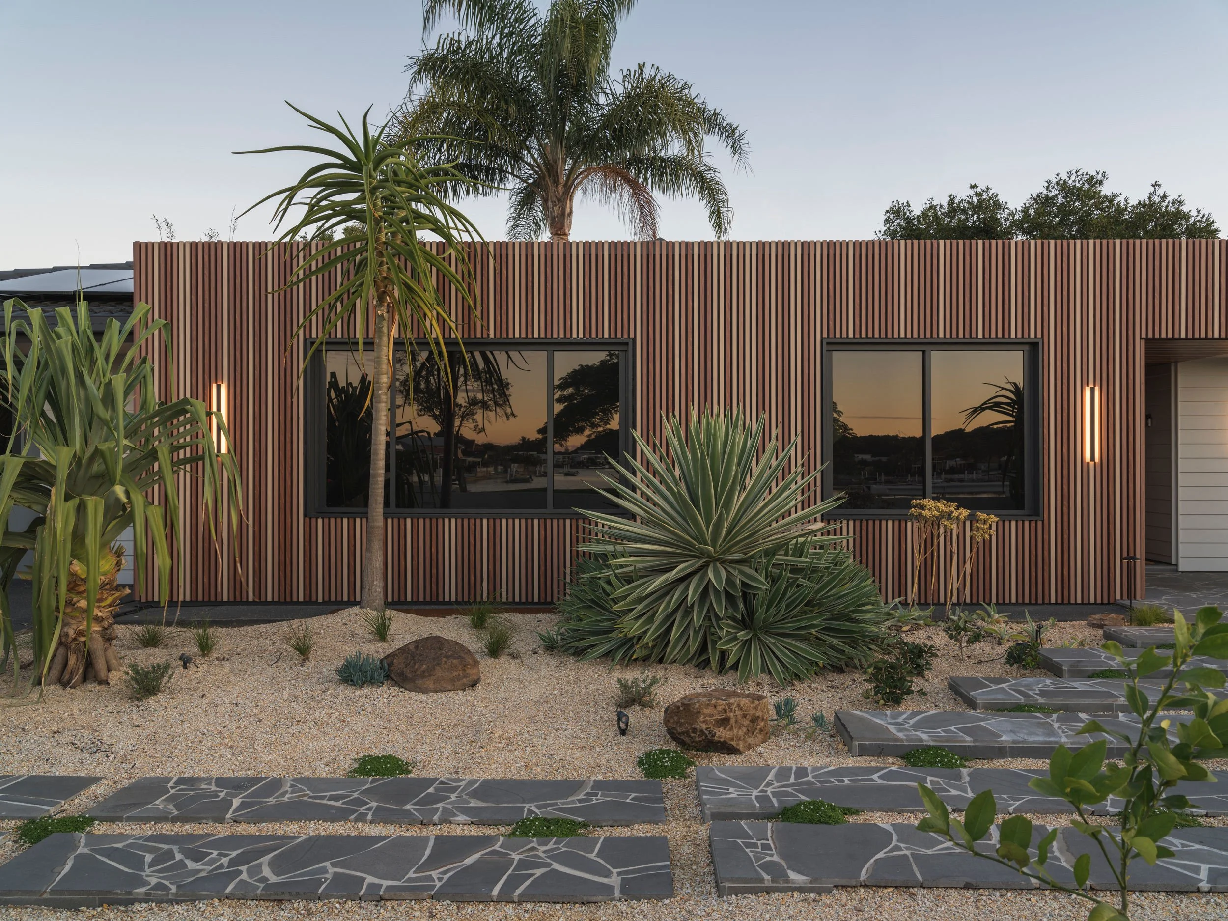Modern house with wooden vertical slat exterior, large black-framed windows, desert-style landscaping with agave and yucca plants, rocky ground, stone pathway, and tropical trees in the background at sunset.