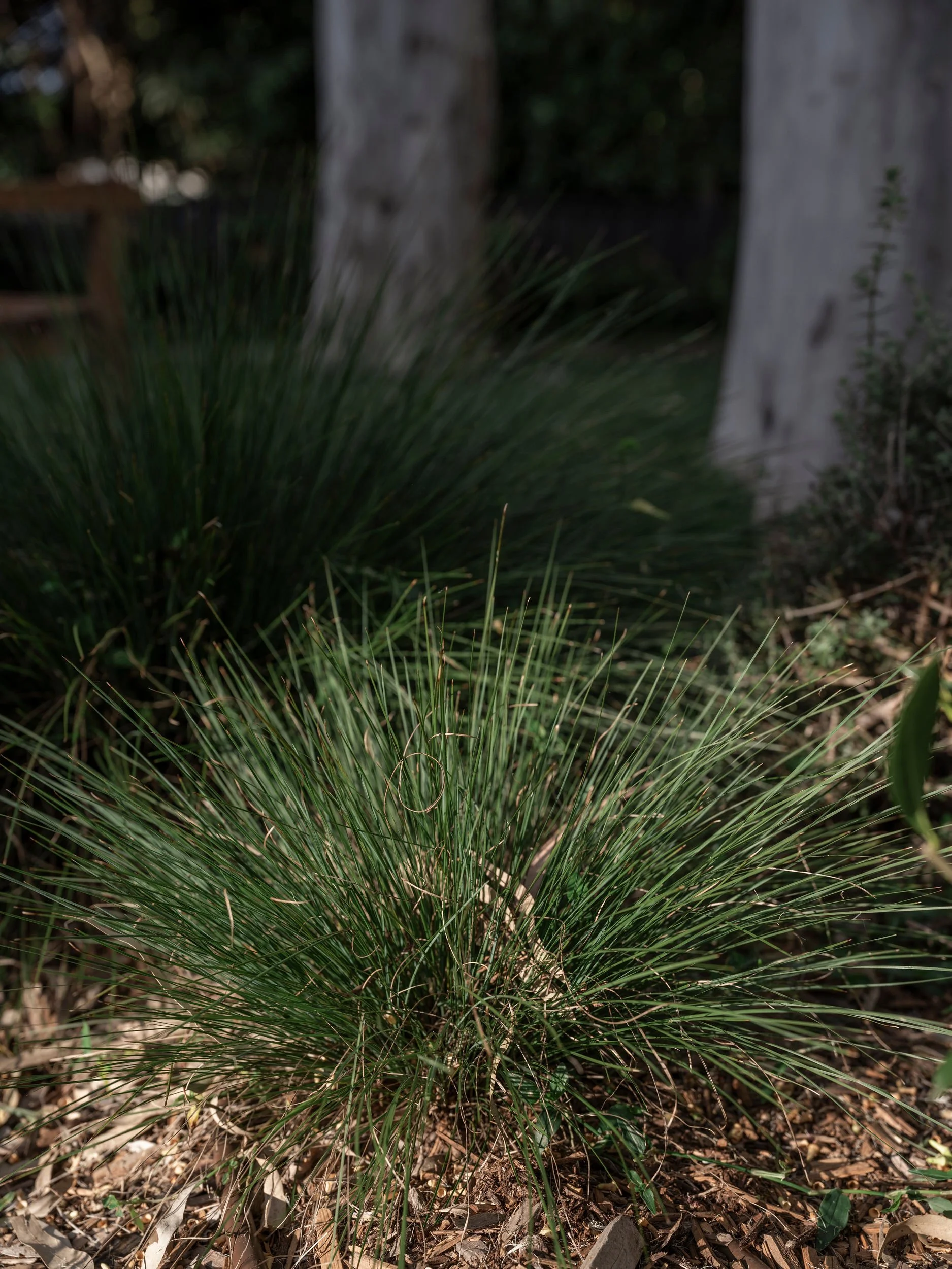 Close-up of green grass plants growing in soil outdoors with trees in the background.