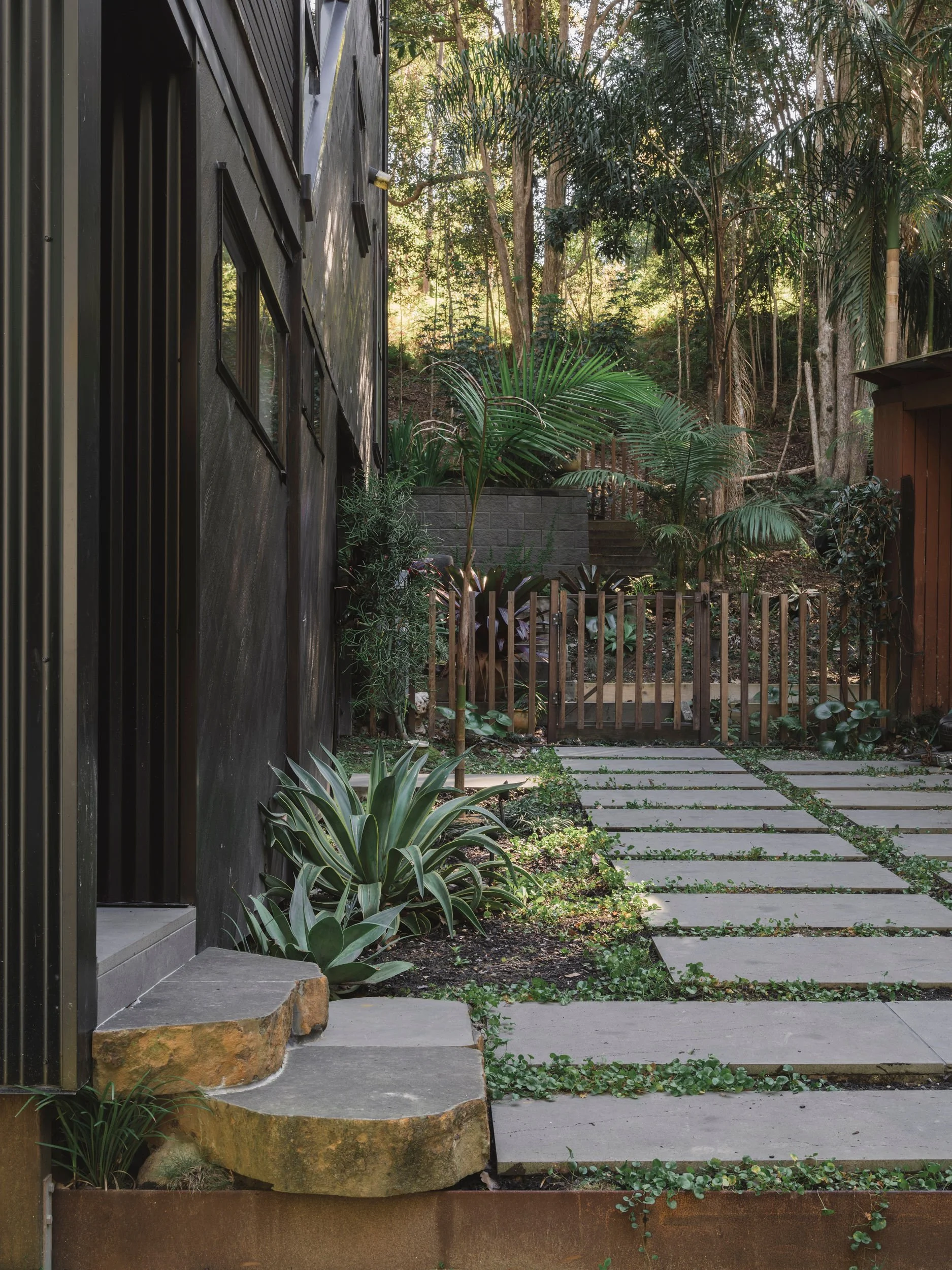 Mondo grass weaves a carpet between bluestone steppers and feature plants.