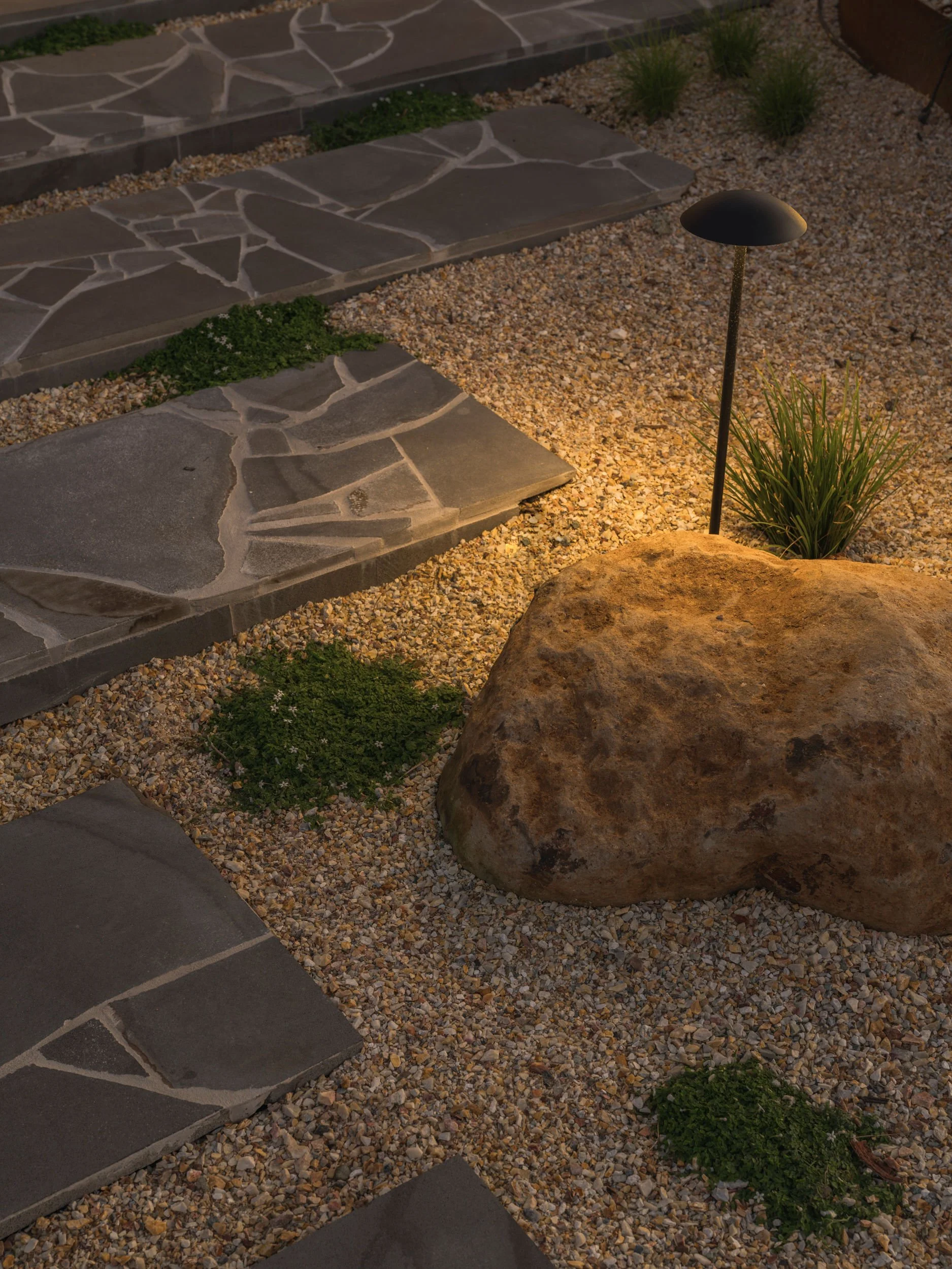 Bluestone crazy paving steppers, feature boulders, lush ground covers.
