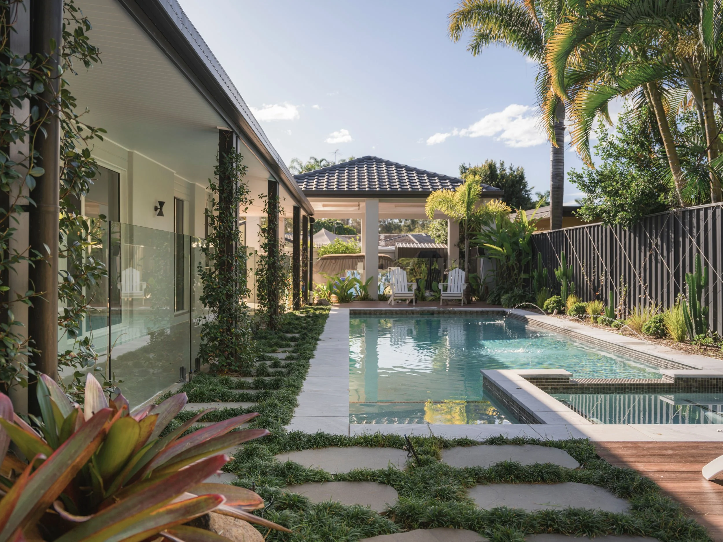 Modern backyard with a swimming pool, surrounded by tropical plants and trees, with a white house and patio seating.
