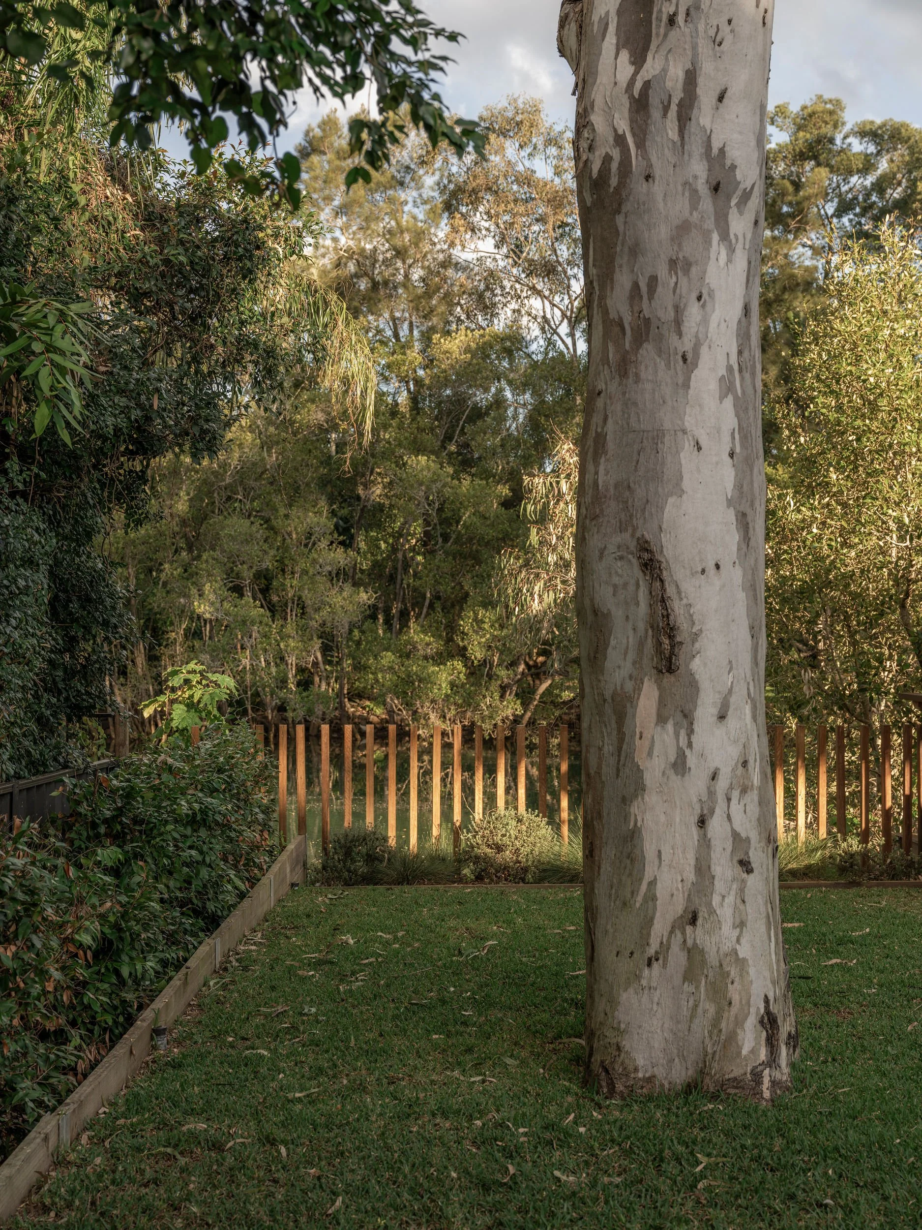 Backyard featuring a large tree trunk, green lawn, surrounding bushes and trees, wooden fence, and cloudy sky.