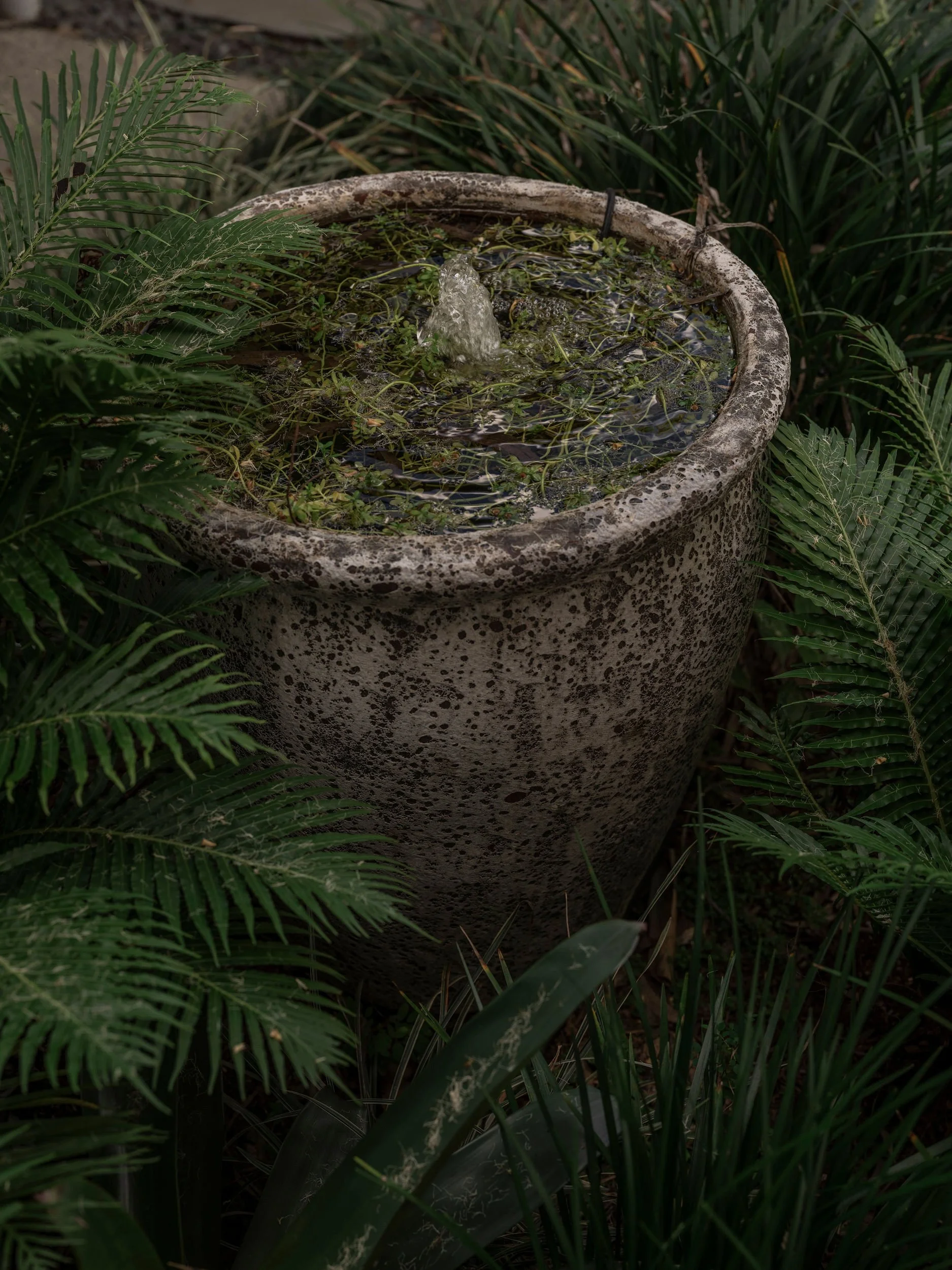 A stone bird bath filled with water and floating plants, surrounded by lush green ferns and other plants.